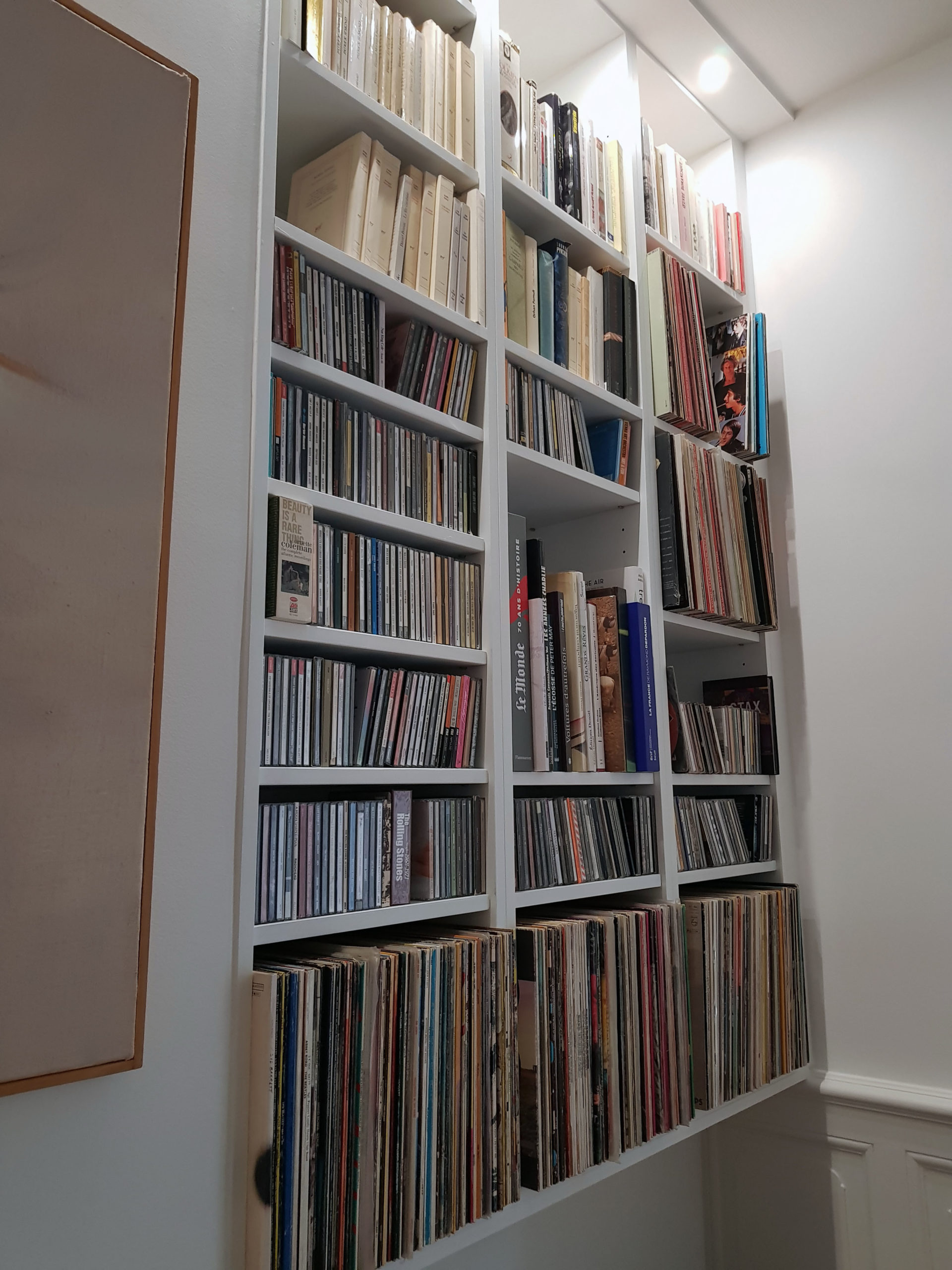 L’idée de départ était de ranger de manière esthétique divers objets hétéroclites tels que des livres et des vinyles, ou encore des connectiques et un casier à bouteilles. Il a donc fallu imaginer une bibliothèque qui s’intègre complètement dans le mur de la pièce principale, dans les alcôves entre la cheminée et les soubassements en boiseries, et ensuite lui assortir des rangements fermés et pratiques à utiliser au quotidien.
