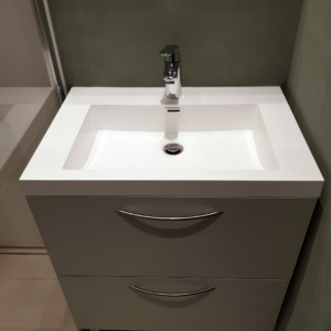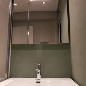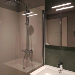 En effet le receveur ainsi que les parois sont en pierre recomposée et d’allure tout à fait contemporaine. Les couleurs douces ainsi que les matériaux créent un ensemble esthétique et facile à vivre.