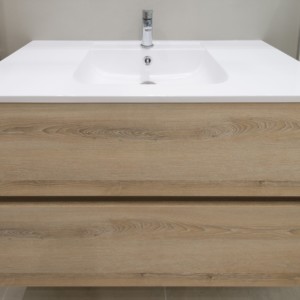 Les ensembles de teintes douces et l’utilisation du béton ciré au mur, confère à cette salles de bains une harmonie apaisante.