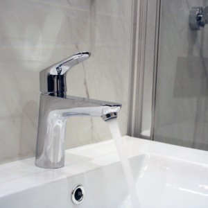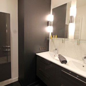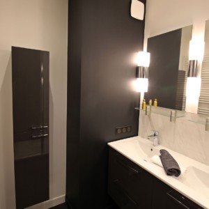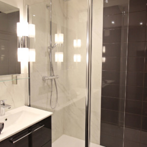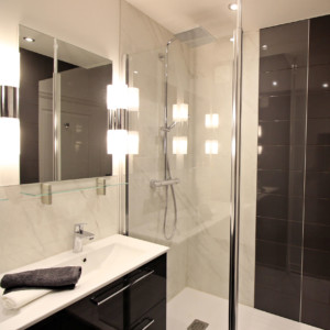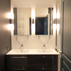 La rénovation de cette pièce d’eau a été réalisée dans un style art déco contemporain.