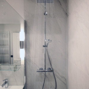 Les grand carreaux de faïence effet marbre ainsi que les tons intemporels rendent cet espace facile à vivre et confortable.